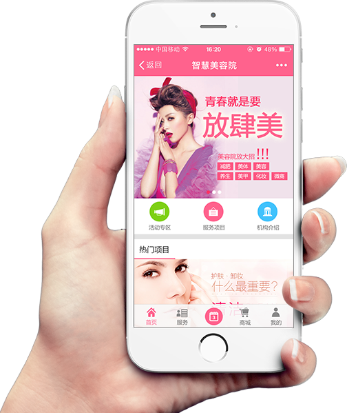互聯(lián)網(wǎng)+美容院的,融合了移動互聯(lián)網(wǎng)和傳統(tǒng)美容院,幫助美容院實現(xiàn)O2O